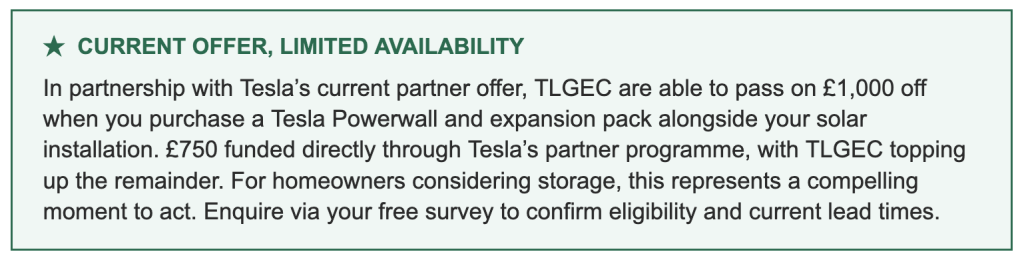 Right now, wholesale panel and battery costs have stabilised after the supply-chain turbulence of recent years. Installer capacity in the premium segment, the firms who take on complex, large-roof projects with the attention they deserve, is limited and lead times are extending. The £1,000 saving available through Tesla’s partner programme, topped up by TLGEC has a finite window.